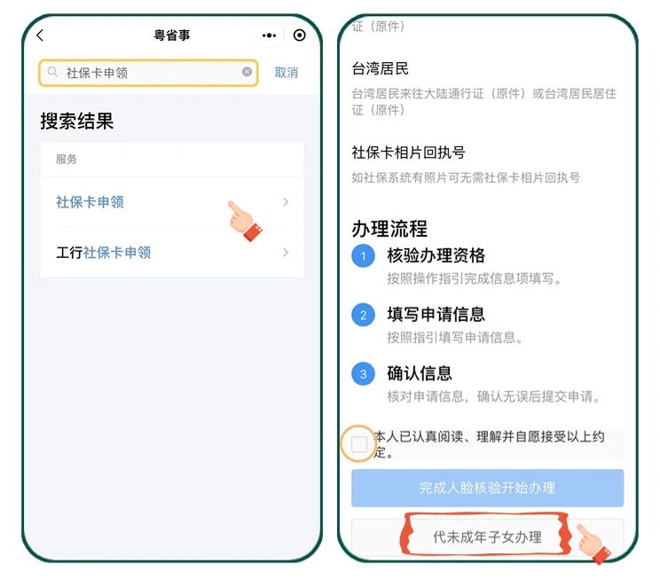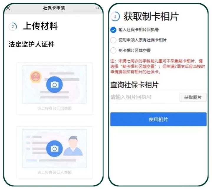 广东省内儿童宝宝社保卡线上办理流程:材料提前准备好,3分钟完成申领操作 2025年 5月 29日 下午10:20 • 社保卡 • 阅读 985 广东省未成年人可通过“粤省事”线上申领社保卡。先进入首页搜“社保卡申领”选【代未成年子女办理】,确认监护人信息并提交申请,上传证明材料,填照片回执号,选领卡方式,领取后前往银行激活,未满7岁儿童可不提供照片。 广东省内少年、儿童、小宝宝等未成年人都可以在线上申领社保卡啦,一起来看具体流程↓↓↓ 📱 1. 打开“粤省事” 打开粤省事小程序,首页搜索“社保卡申领”。 选择【代未成年子女办理】进入操作界面。 📝 2. 确认并填写信息 核对信息,选择法定监护人与子女关系。 填写子女信息,点击【资格校验】提交。 ⚠️ 确保信息与户口簿/身份证完全一致! 📤 3. 上传证件材料 户口簿办理:监护人身份证正反面 + 户口本(主页/户主页/子女页)。 身份证办理:监护人身份证正反面 + 子女身份证正反面 + 出生证明。 🔍 材料需清晰无反光,建议用扫描件。 📸 4. 获取制卡相片 输入相片回执号(可在“DT证件照”或照片回执助手小程序上在线获取;未满7周岁的儿童可以不用相片),后获取制卡相片。 💡 填写时注意字母大小写。 📮 5. 选择领卡方式 方式 说明 时效 网点领卡 银行网点自取 5-7工作日 邮寄到付 邮政EMS寄送 7-10工作日 💳 6. 激活社保卡 持卡人需携带证件原件到所选银行网点激活。 ✅ 激活后即可正常使用医保报销、缴费等功能! ⚠️ 重要注意事项 仅限法定监护人操作办理(父母或法院指定监护人) 激活时需同时携带:社保卡+监护人身份证+子女出生证明/户口簿 编辑:zphzzs,如若转载,请注明出处:https://www.dtzjz.com/sbk/2372.html DT证件照照片回执照片回执助手相片回执号 赞 (4) 生成海报 2025深圳社保卡线上办理全攻略(附社保卡照片回执号获取指引) 上一篇 2025年 5月 29日 上午12:09 证件照片回执办理避坑指南 下一篇 2025年 5月 30日 下午6:46 相关推荐 社保卡 广东省社保卡网上办理全攻略:16周岁及以上人员、16周岁以下人员、港澳台居民办理指南!附照片回执办理指引 广东省社保卡网上办理全攻略,涵盖16周岁及以上、16周岁以下、港澳台居民的申领条件、材料、流程及注意事项。重点指导通过“粤省事”小程序和“照片回执助手”小程序完成申领,附赠照片回执办理指引,助您轻松办理社保卡。 2025年 4月 9日 4241 社保卡 广东新政:新生儿出生180天内可办医保,不再受户籍限制 近日,广东省医疗保障局印发了《广东省医疗保障局关于做好新生儿医疗保障工作的通知》(以下简称《通知》)。 《通知》明确了两部分内容: 1、新生儿监护人可凭新生儿出生医学证明,于新… 2024年 3月 25日 4280 社保卡 广东省少儿社保卡网上办理流程 一、申请资格校验 1、进入粤省事App或微信小程序,首页搜索“社保卡申领”,点击【代未成年子女办理】进入办理页面; 2、确认法定监护人信息,选择“法定监护人与申领人关系”并完善申领… 2023年 12月 10日 6061 回执办理指南 新生儿办社保卡,证件照怎么拍?照片回执怎么办?宝爸宝妈别发愁!我来分享点实用经验,手把手教你们轻松搞定! 给宝宝拍社保卡照片要选纯色背景、光线柔和,趁宝宝情绪好时抓拍,避免美颜和闪光灯,确保双眼看镜头、耳朵露出。照片合格后可通过小程序在线办回执,或去照相馆/社保点办理。注意宝宝舒适度,耐心多试即可顺利搞定。 2025年 8月 31日 1552 专题解答 深圳社保卡照片回执、居住证照片回执与身份证照片回执是一样的?能通用吗?专题解答! 在办理深圳社保卡的过程中,不少用户遇到了这样一个困惑:明明要办理社保卡照片回执,收到的却是身份证照片回执。这是怎么回事呢? 2025年 3月 12日 6823 社保卡 2025深圳社保卡线上办理全攻略(附社保卡照片回执号获取指引) 深圳金融社保卡线上办理指南发布,参保人通过深圳社保公众号实名认证即可申领,16岁以下需监护人材料。照片回执可通过小程序15元办理,制卡周期12个工作日。支持邮寄全国,激活需本人到场(行动不便可预约上门),未成年人由监护人代办。 2025年 5月 29日 1.9K2 专题解答 广州社保卡丢失了该怎么办?赶紧收藏解决办法 为避免个人权益和账户资金受到侵害,社保卡丢失后要及时办理挂失,建议马上拨打12343或12345热线办理社保卡挂失,然后请再拨打社保卡卡面银行热线挂失银行账户。 2023年 5月 31日 5761 社保卡 一图读懂|广东省社会保障卡居民服务一卡通条例 《广东省社会保障卡居民服务一卡通条例》于2024年11月1日起施行。 2025年 1月 18日 1831 专题解答 办理深圳社保卡选择招商银行在线申领时,与照片回执相关的3个常见问题及解答 时常有用户反馈一些在“深圳社保”公众号申领社保卡选择“招商银行”在线申领时遇到的问题。小编今天给大家梳理了常见的3个问题及答案。 问题一:系统提示“您在社保系统缺失社保卡照片,请提… 2025年 1月 15日 1.0K3 社保卡 2025深圳金融社保卡线上办理流程最新指南、社保卡照片回执办理指引以及办卡常见问题解答 近年来我国“放管服”改革持续深化,行政服务多推行网上自助办理。深圳居民办理社保卡更加便捷,无需到现场排队,在家手指操作,社保卡就能快递到家。深圳2025金融社保卡办理指南:线上流程、照片回执与问题汇总。 2025年 3月 12日 1.4K2